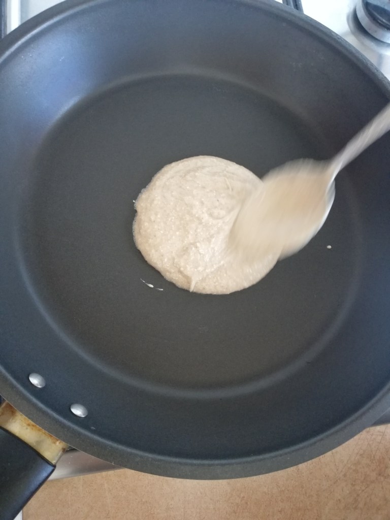 ⦁ Šildykite didelę keptuvę ant vidutinės ugnies. Kai įkais, įpilkite šiek tiek kepimo aliejaus, kad padengtumėte keptuvę. Tada šaukštu užpilkite maždaug 2 šaukštus tešlos ir sumažinkite šilumą iki silpnos. Tai naudinga kepant lėčiau ir mažiau nei vidutiniškai jūsų blynus. Uždenkite dangčiu, kad centras galėtų kepti.